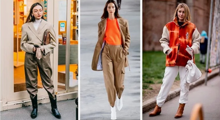 Смелый, но очень стильный ход. Главное правило — контраст силуэтов. Узкие казаки уравновешивают объемные брюки, создавая гармонию.